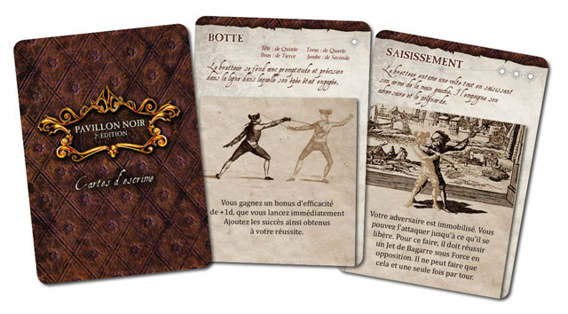 • Cartes d'escrime : pas de changement particulier, mais elles n'ont pas le même standard de qualité que les cartes offertes (voir plus bas). Il s'agit ici de cartes à jouer, à bord rond, donc légèrement plus qualitative.