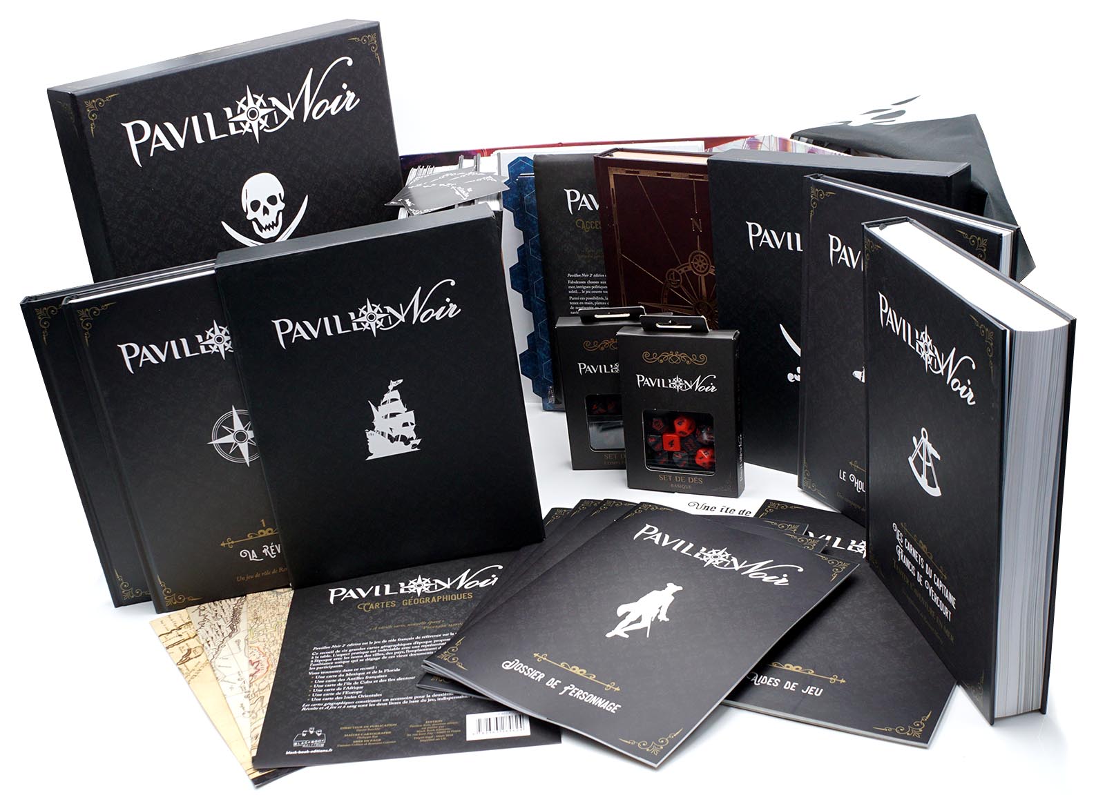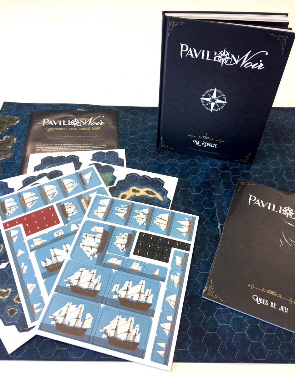 Pavillon Noir 2e édition se compose de deux livres de base : La Révolte, qui s'attache plus particulièrement aux personnages, à leur progression et à l'historique en général, et À Feu et à sang, qui s'attache lui à la navigation, aux navires, à la vie à bord d'un bateau pirate et aux batailles navales qui ne manqueront pas d'émailer la vie de vos pirates !