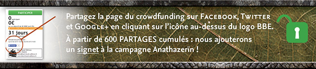 Il me semblait bien qu'un signet devait être offert aux souscripteurs (à partir de 600 partages sur les réseaux sociaux). Je n'en avais pas trouvé lors de la livraison de la campagne mais je ne m'étais pas inquiété outre mesure. D'autant que le signet n'était pas mentionné dans le récapitulatif (en haut de page) de tout ce qui avait été débloqué. Je m'étais dit que c'était passé à la trappe. Et puis je viens d'y repenser, j'ai bien revérifié tout ce qui m'avait été livré et effectivement, pas de signet. Est-ce normal ? Etant donné qu'il était tout de même mentionné comme récompense pour avoir atteint les 600 partages ? Merci par avance pour votre réponse.
