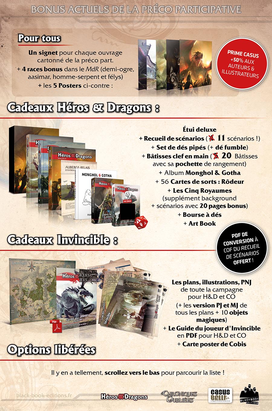 Notez que cette précommande participative vous propose des options et des cadeaux liés de manière indépendante à la campagne Invincible et aux ouvrages Héros & Dragons. Si les options seront disponibles pour tout le monde, seuls les participants ayant sélectionné une offre à 130 € bénéficieront des cadeaux "Héros & Dragons" et seuls les participants ayant sélectionné une offre Campagne bénéficieront des cadeaux "Invincible". Evidemment, ceux qui auront sélectionné les deux (que ce soit dans les contreparties ou les options) auront eux, droit à tout !