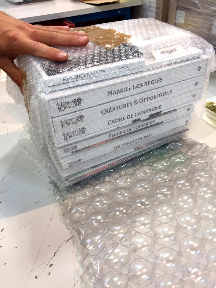 Vous êtes nombreux à attendre patiemment votre envoi Héros & Dragons : le travail se poursuit à l'entrepôt pour démanteler les 70 palettes de matériel reçu et confectionner soigneusement vos colis (12 kilos pour certains, il faut bien protéger tout ça !). Il se murmure même dans les corridors sombres du 5e sous-sol que le maître des esclaves qui veille sur ce labeur a fait clouter son fouet pour accélérer la cadence...