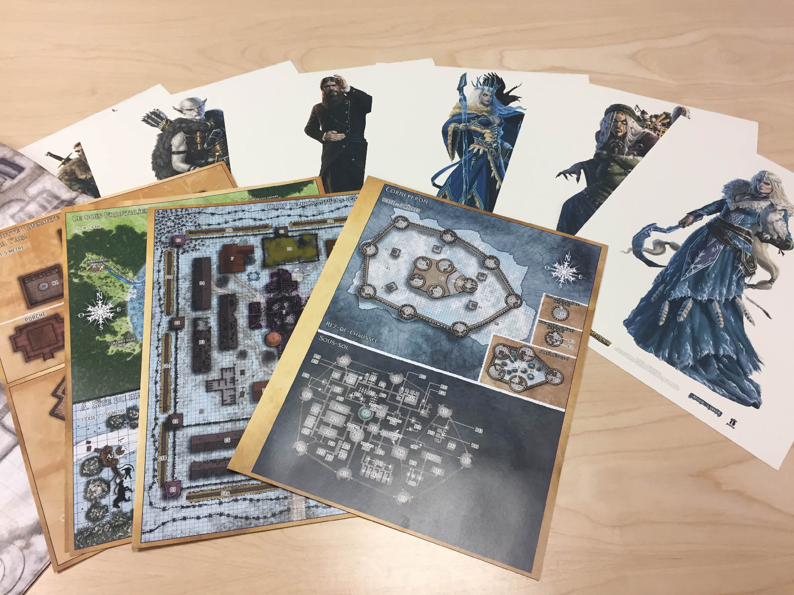 Comme vous pouvez le voir ci-dessous, nous avons reçu des exemplaires papier des plans offerts lors de la précommande participative du Règne de l'hiver et des lithographies des personnages de couverture de la campagne Pathfinder.