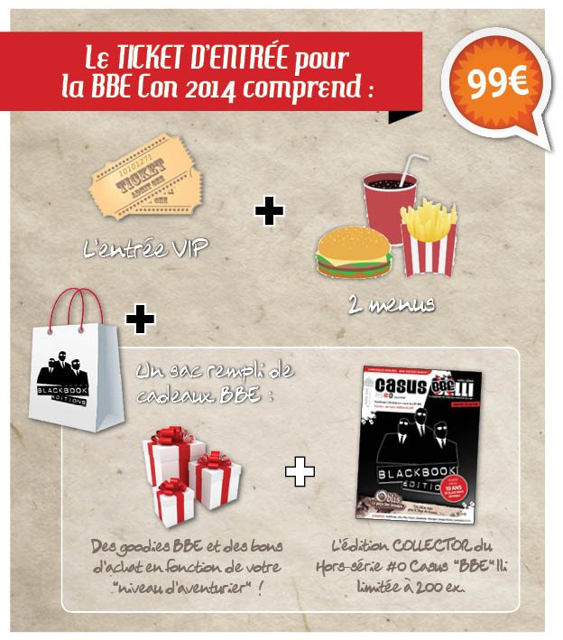 Entrée BBE Con + sac goodies + bon d'achat + Hors-série Casus collector + 2 menus + entrée soirée VIP vendredi soir + priorité aux inscriptions des tables (pour prendre plusieurs place, ajoutez des places supplémentaires dans les options).
