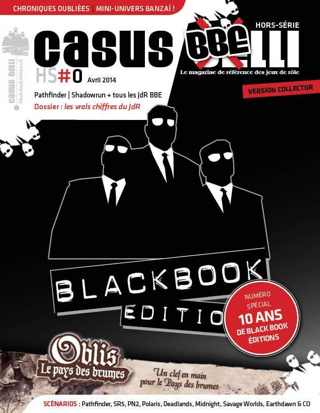 En juin 2004 à Lyon, trois hommes en noir se sont lancés dans la grande aventure de l'édition de jeu de rôle, donnant naissance à Black Book Editions. 10 ans après, il est l'heure de faire le bilan... et quoi de mieux que de le faire en compagnie de tous ceux qui ont aidé BBE à devenir ce que la société est aujourd'hui : les partenaires et auteurs américains, les auteurs français, les équipes techniques et de traduction, la rédaction de Casus Belli et, surtout VOUS, qui achetez et jouez à tous ces jeux.