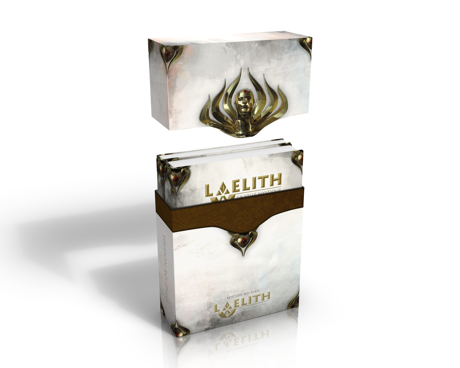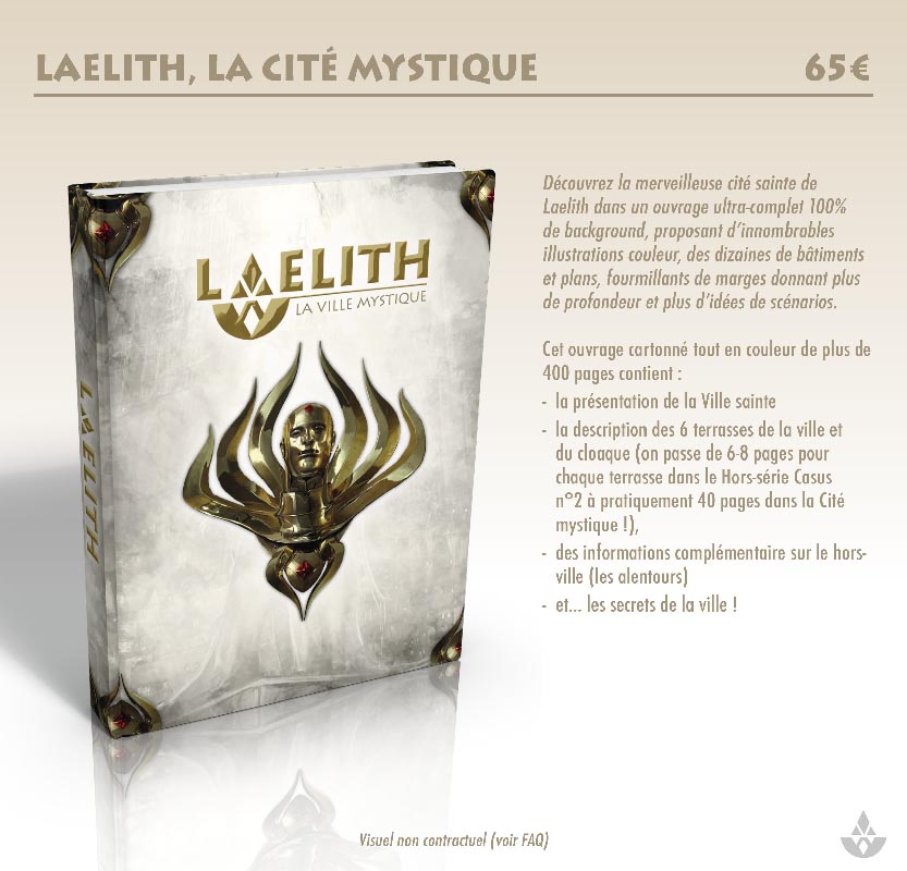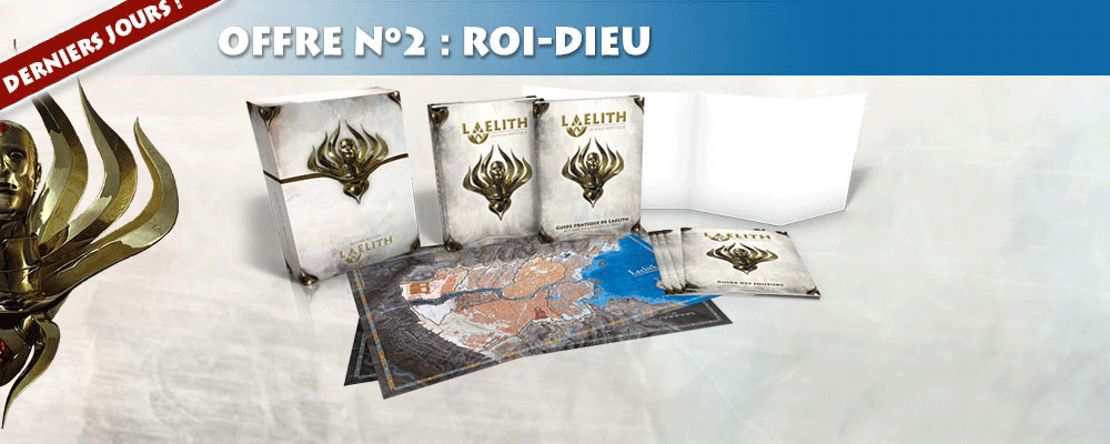 - L'édition Roi-Dieu : une boîte fourreau de luxe intitulée "Roi-Dieu" dans laquelle se glisseront les ouvrages suivants : Laelith, la Cité mystique, le Guide pratique de Laelith, 4 Guides du joueur de Laelith et 2 grandes cartes de Laelith.