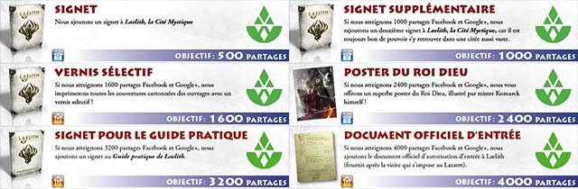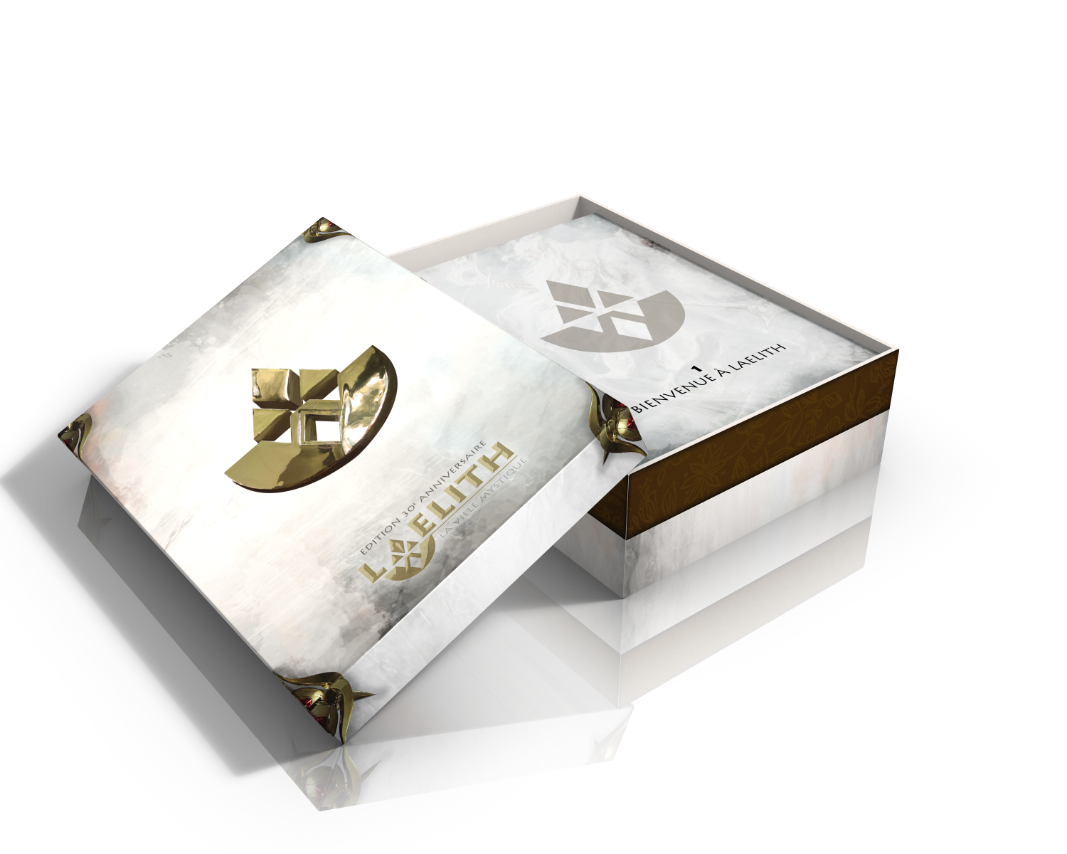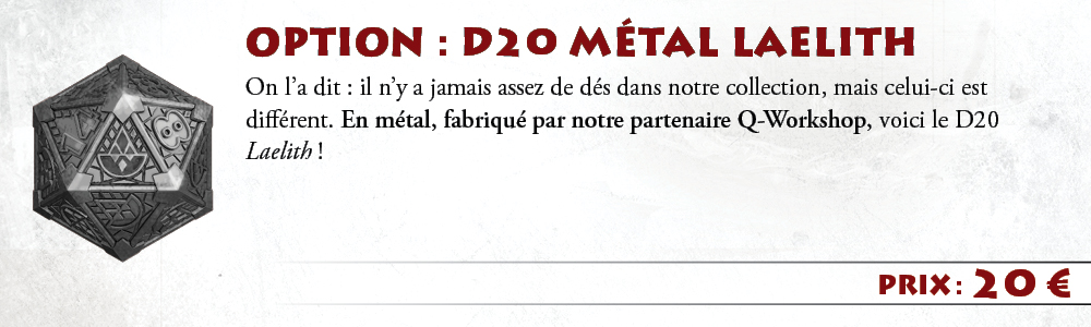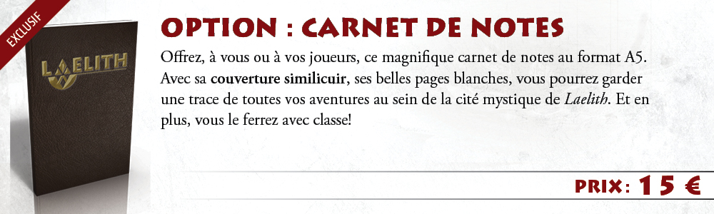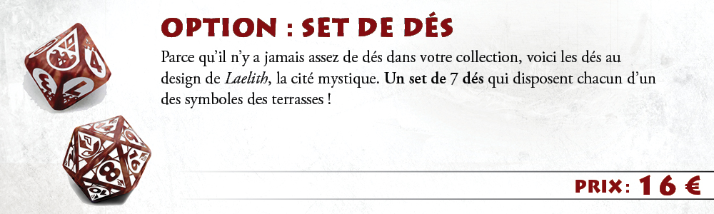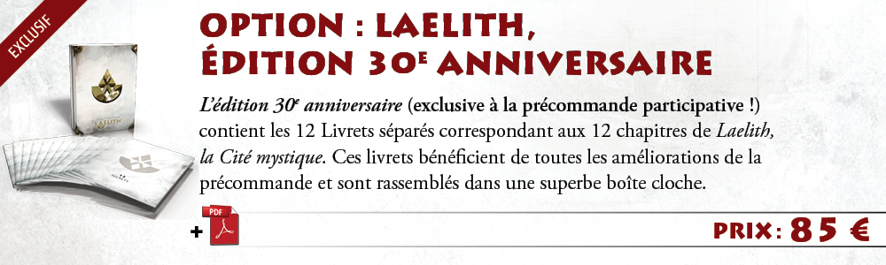 - L'édition 30e anniversaire (exclusive à la précommande participative !) : une boîte cloche de luxe dans laquelle se trouveront : les 12 Livrets séparés correspondant aux 12 chapitres de Laelith, la Cité mystique, le Guide pratique de Laelith, 4 Guides du joueur de Laelith et 2 grandes cartes de Laelith.