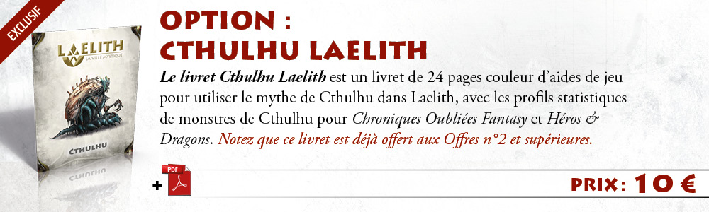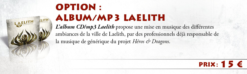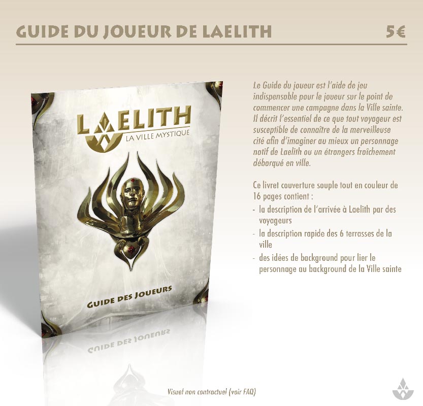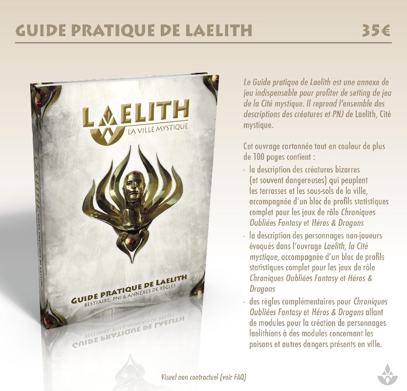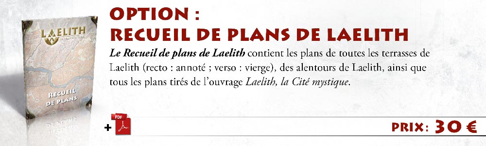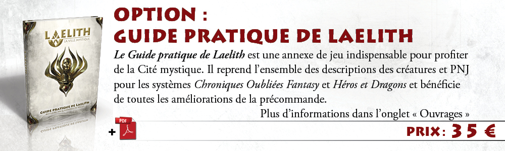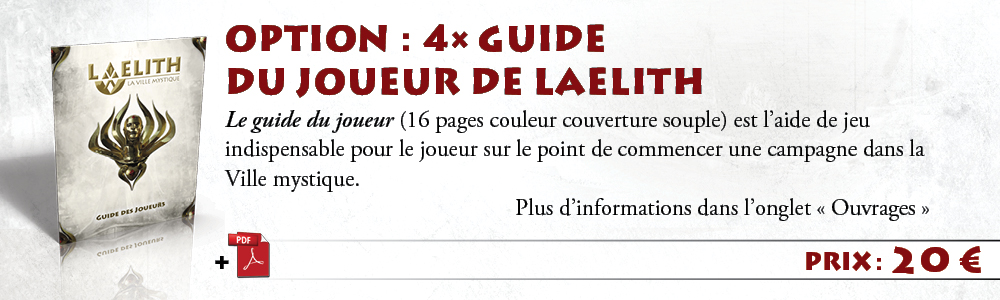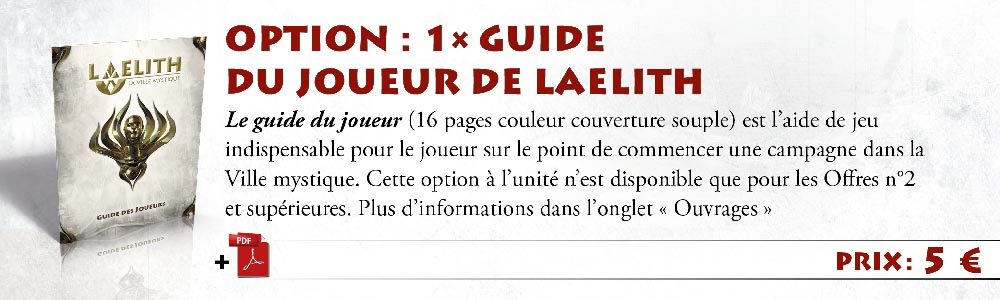 1 exemplaire de Laelith, la Cité mystique + Guide pratique + 2 cartes A2 de Laelith (papier + PDF) + nom dans Laelith
