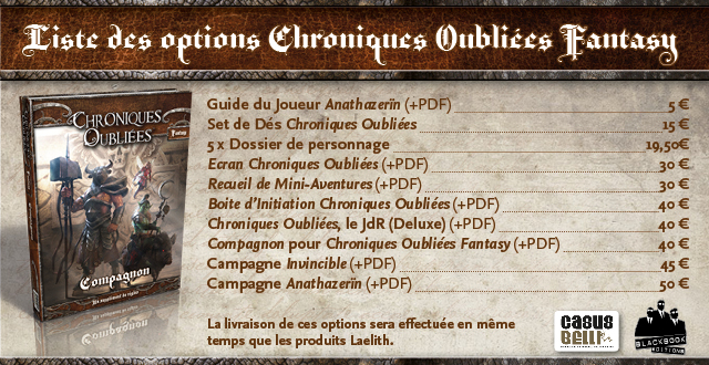 Nous avons regroupé ci-dessous les listes des options proposées pour les systèmes de jeu Chroniques Oubliées et Héros & Dragons. Si vous n'êtes pas familier avec ces deux mécaniques de jeu, n'hésitez pas à poser vos questions dans les commentaires de ce projet. Et si vous débutez dans le jeu de rôle, nous vous invitons à choisir l'édition Deluxe de Chroniques Oubliées Fantasy qui propose des règles simples mais pas simplistes et vous guidera pas à pas dans la mise en place d'une partie de jeu de rôle.