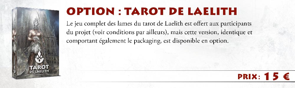 À la demande générale, nous avons procédé à un nouveau tirage du Tarot de Laelith (identique au premier tirage) : sa fabrication est en cours, pour une livraison qui ne va pas tarder en version papier (pas de version PDF disponible).