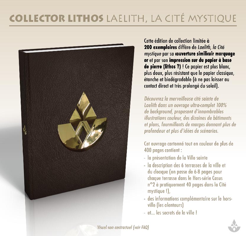 - L'édition Lithoracle : une boîte fourreau de luxe intitulée "Lithoracle" dans laquelle on retrouvera : la version Collector limitée à 200 exemplaires et imprimée sur du papier en pierre (!) de Laelith, la Cité mystique, le Guide pratique de Laelith, 4 Guides du joueur de Laelith et 2 grandes cartes de Laelith.