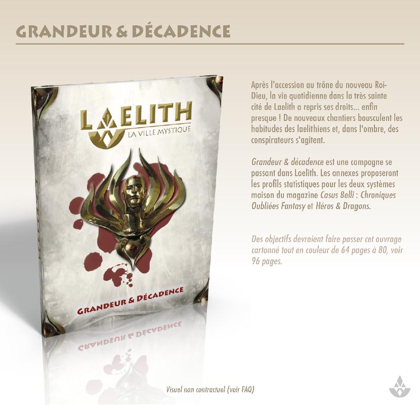En plus des innombrables illustrations déjà réalisées au cours des deux dernières années (!) - plus d'une centaine à 90% en couleur - BBE a investi une somme d'argent très élevée à l'échelle du jeu de rôle français pour offrir les meilleurs conditions de travail possible aux auteurs (2 à 3 fois les tarifs pratiqués dans le milieu du JdR). Pour obtenir cette Laelith de rêve, à la fois respectueuse de l'esprit de la "vieille" Laelith tout en proposant de nombreuses nouveautés et développement de qualité et apportant un souffle nouveau, il faut du temps et un travail de coordination monumental rendant le projet impossible sans cet investissement de départ, consenti par passion, mais également avec la conviction que les rôlistes répondront au rendez-vous !