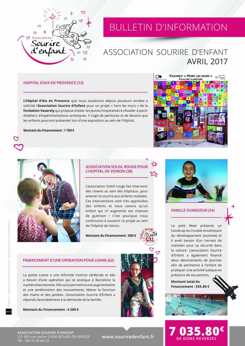 Nous vous tiendrons donc informés des avancées du projet Zoom Zoom Zoom et en attendant, voici également le PDF des dernières actions menées par Sourire d'enfant (cliquez sur l'image ci-contre).