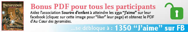 A mesure que la cagnotte et le partage de la page de la Sacoche sympatoche : Pathfinder sur Facebook et Google+ augmente, des objectifs seront débloqués et permettront de rajouter des PDF en bonus dans les différentes contreparties.
