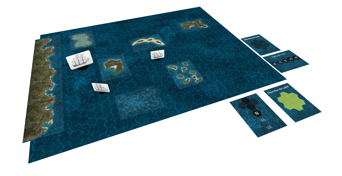 Ensuite, sachez que nous avons achevé le visuel de la Bataille navale, un gros morceau composé de pions cartonnés pour les navires (reprise à l'échelle des visuels de A Feu et à sang), d'une zone de jeu dotées d'hexagones sur lesquelles placer des zones modulable pour pouvoir utiliser les règles de jeu d'A feu et à sang comme il se doit. Nous espérons que ça vous plaît.