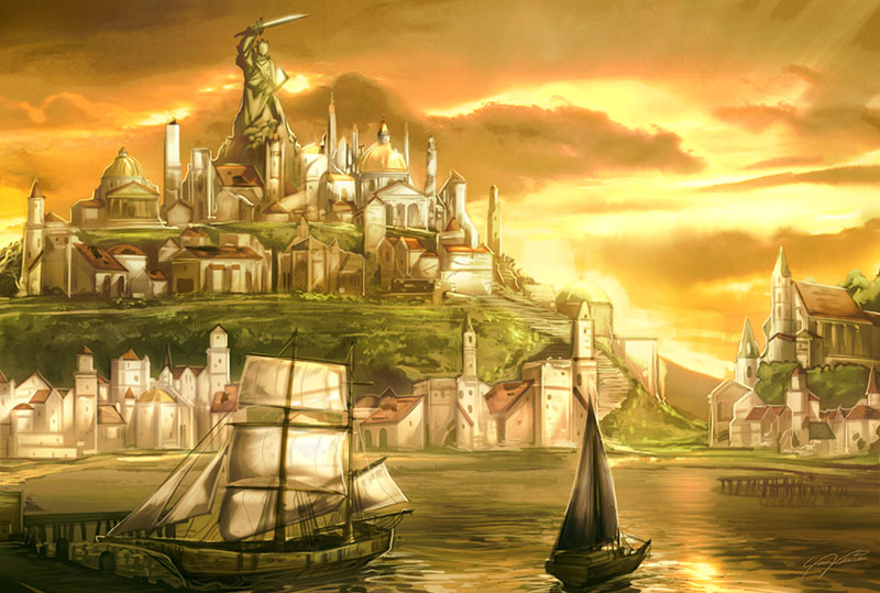Cité parmi les plus hétéroclites et raffinées de la mer Intérieure, Couronne d’Ouest est une énigme. Semblable à de nombreuses villes ou pays connus pendant le jour, que ce soit pour son architecture variée ou pour les gens venus de tout l’Avistan ou du Garund qui s’y installent, ses nombreux sites religieux, encore actifs ou dégradés, continuent d’attirer les pieux, les curieux et les sournois. Même les ruines de la partie nord de la ville ont leur intérêt, pour ceux qui y recherchent des choses pas très légales ou en farfouillent les dangereux décombres en quête de trésors rares. Mais dès que le soleil se couche, seuls les fous s’aventurent hors de chez eux, car les bêtes de l’ombre rôdent dans chaque ruelle et sur chaque voie navigable plongée dans l’obscurité.