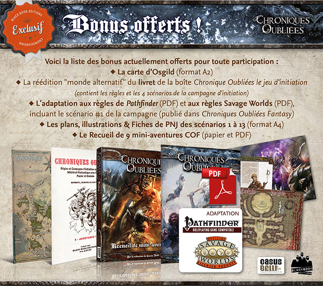 Comme vous le savez sans doute, nous souhaitons garder la maîtrise de nos crowdfundings afin de pouvoir livrer son contenu dans des délais courts. C'est pourquoi nous avons décidé de continuer dans l'ajout de mini-aventures, grâce au soutien de nos équipes, pour à la fois être en mesure de continuer à vous proposer des objectifs intéressants pour vos parties de Chroniques Oubliées Fantasy et de livrer l'ensemble du crowdfunding comme prévu peu après la rentrée.