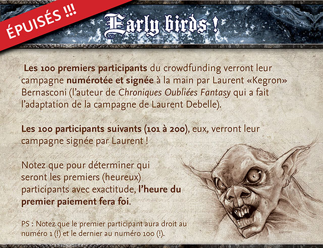 Les 200 premiers participants auront donc droit à la dédicace de Laurent "Kegron" Bernasconi, l'auteur de Chroniques Oubliées Fantasy et les 100 premiers participants auront également droit à la numérotation (1 à 100) de leur exemplaire !
