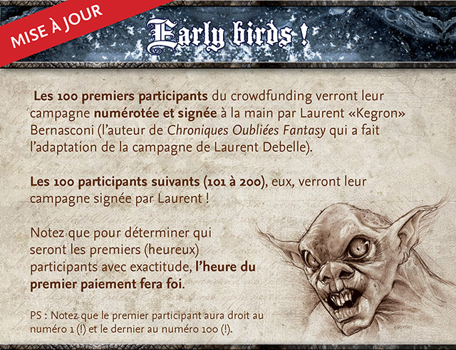 Pour ne pas spoiler les Early Birds mais permettre aux nombreux déçus de la première heures de l'être un peu moins, nous vous annonçons que les participants 101 à 200 auront également droit à une dédicace de Laurent, mais sans la numérotation !