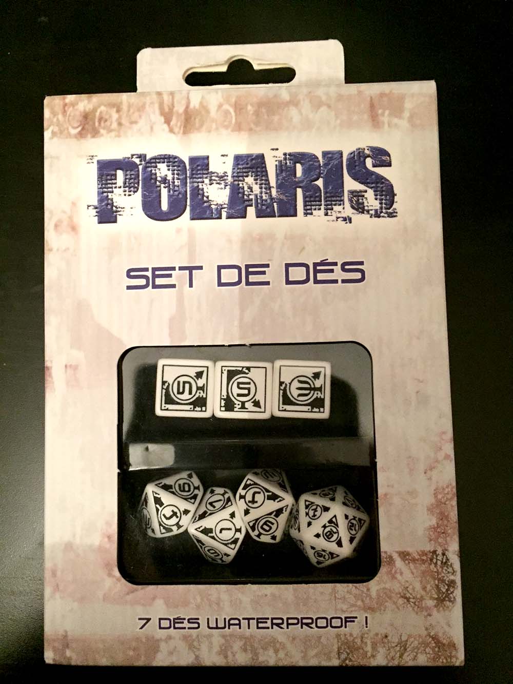 Mais la nouvelle, c'est que le Set de dés Polaris (blanc, celui du kickstarter est bleu) est arrivé au local. Nous sommes vraiment contents du résultat, notamment au niveau de la lisibilité, qui est vraiment très bonne, comme vous pouvez le voir sur la photo ci-contre.