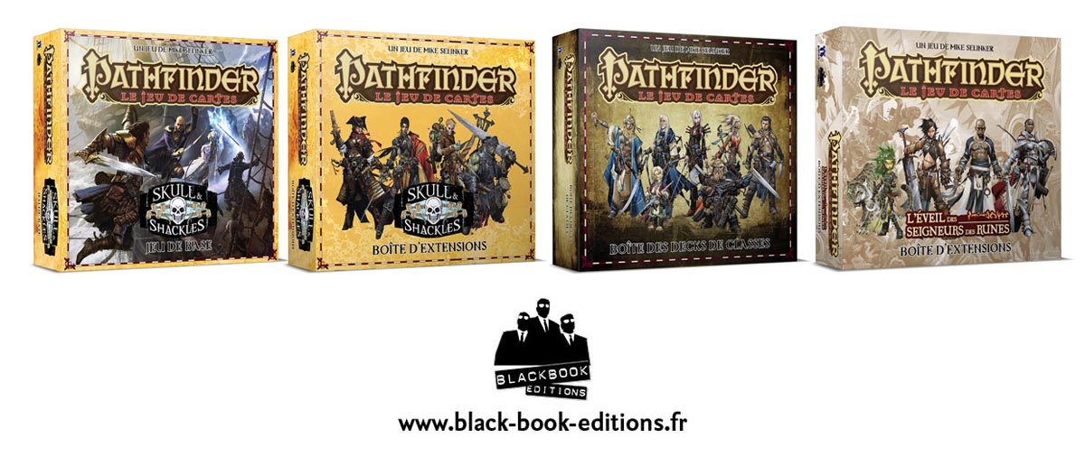 Notez que la nouvelle formule de publication du jeu de cartes Pathfinder est plus économique car elle vous propose en deux grosses boîtes (Boîte de base et Boîte d'Extensions) l'ensemble de la campagne Skull & Shackles, sans oublier également la Boîte des decks de classe et la Boîte d'Extensions de L'Eveil des Seigneurs des runes (qui rassemble la réimpression du deck d'Extension de personnage et des Aventures 2 à 6).