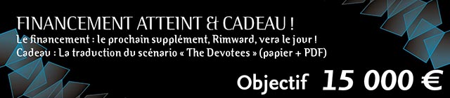 - Nous avons décidé d'offrir la version livret papier + PDF de la traduction du scénario "The Devotees" à tous les souscripteurs si nous atteignons les 15 000€ nécessaire à la suite de la gamme. Il ne serait pas juste de ne pas récompenser par un petit plus (même si la marge de manoeuvre financière est faible) à ceux qui auront soutenu cette préco participative.