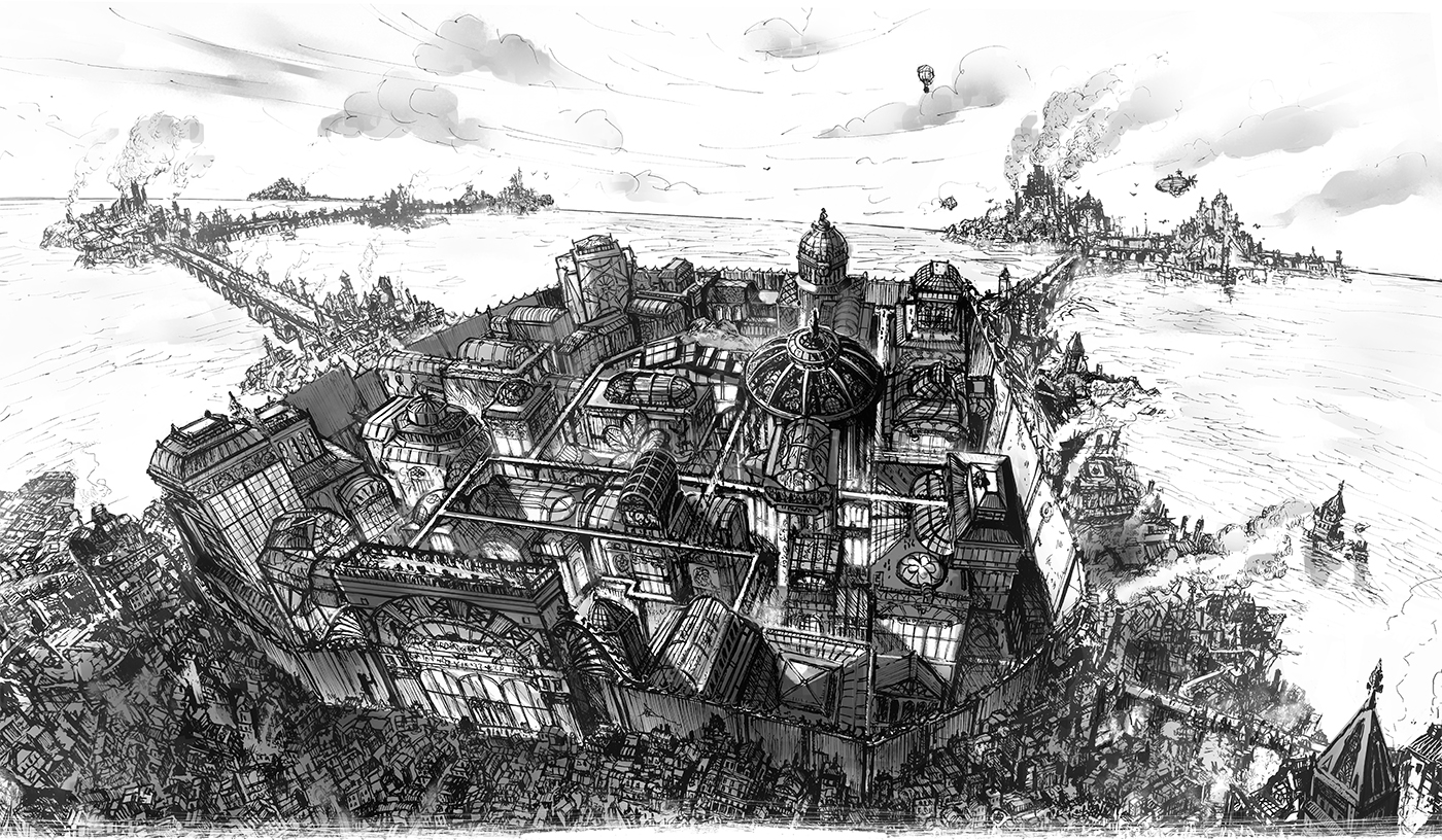 Écryme décrit avant tout un univers urbain qui s’est développé à outrance sur les îles émergentes. De gigantesques cités industrielles ont été construites : Éole, fière de sa maîtrise des vents, possède d’immenses chantiers aéronautiques où se fabriquent les dirigeables qui sillonnent le monde, Venice, capitale culturelle, vit sous la coupe d’une artistocratie décadente, Méthalume ressemble à une véritable cité-usine aux proportions démesurées.