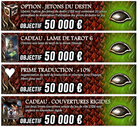 Pour consulter la description des 3 boîtes de jeu proposées en contrepartie, dirigez-vous vers l'onglet "Ouvrages" (entre l'onglet "Accueil" et "News" de cette page)