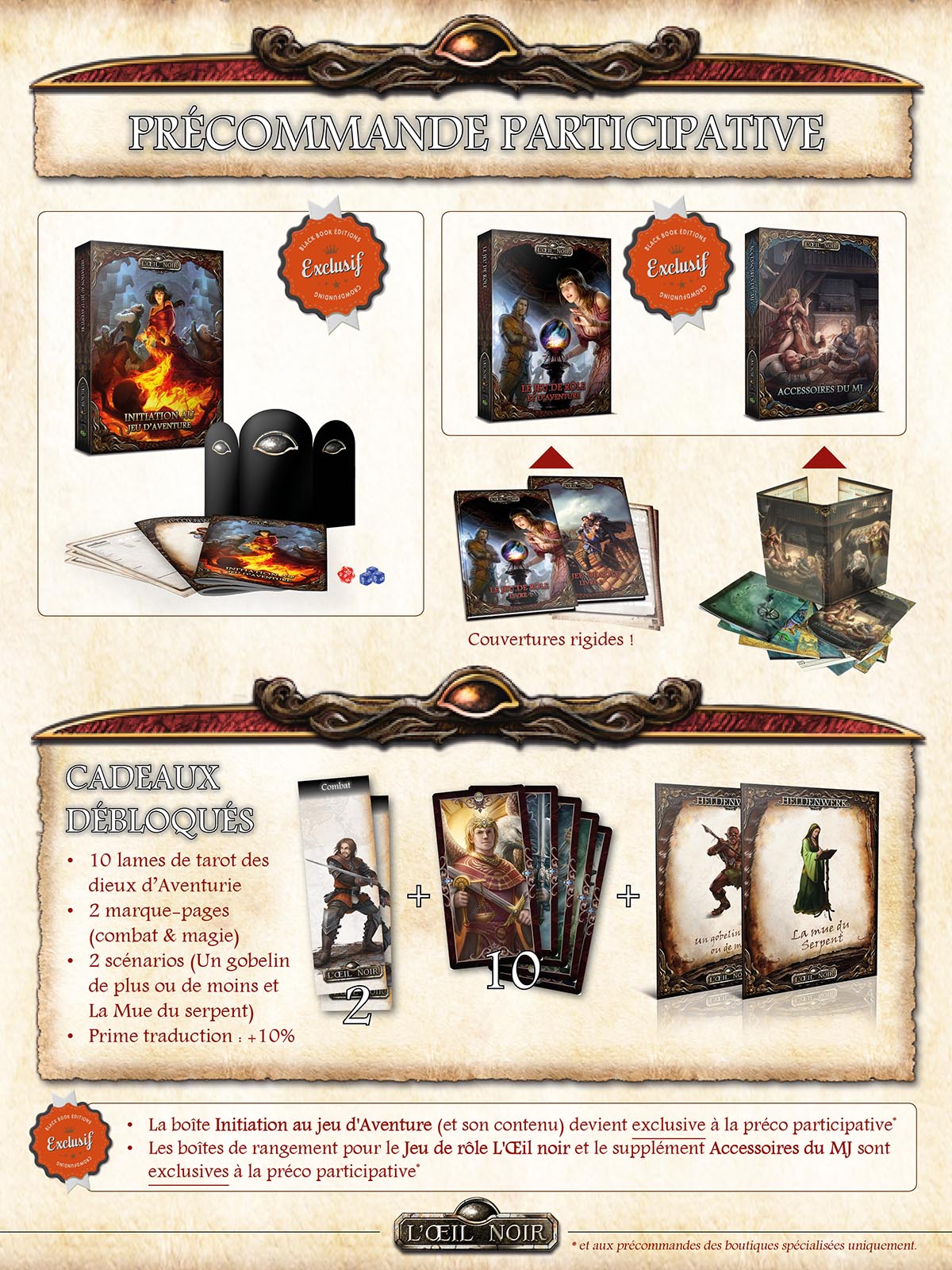 1 exemplaire des 3 boites de L'¼IL NOIR : Initiation au jeu d'Aventure, Le jeu de rôle et Accessoires du MJ (PDF + papier) + tous les cadeaux débloqués. Limitée jusqu'à 23h59 ce lundi 11 avril