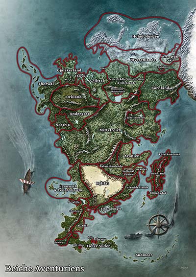 Le cœur de l’Aventurie est occupé par le Nouvel Empire, que l’on appelle aussi, plus simplement, Empire. Dominé par de puissants seigneurs et maintenu uni par la jeune impératrice Rohaïa, l’Empire est une patrie d’audacieux chevaliers aussi bien que de Nains hirsutes qui ont établi leurs fontis et leurs villes souterraines profondément sous la montagne. Le centre de l’Empire est Gareth, de loin la ville la plus importante du continent. L’Empire est impliqué dans une lutte éternelle et obstinée contre les Orks, les habitants des steppes au nord-ouest de l’Aventurie, nommées le Pays des Orks. On les appelle aussi les fourrures-noires à cause du pelage noir qui recouvre tout leur corps. Ils sont sauvages, barbares et profitent de chaque occasion pour mesurer leurs forces avec tous ceux qui sont assez stupides ou courageux pour s'aventurer sur leurs terres.