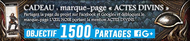 Mais le week-end a été productif, puisqu'un objectif social est également tombé (et largement !), et que le marque-page "MAGIE" est donc offert lui aussi. La suite, c'est un nouveau marque-page, pour la partie magie divine, "ACTES DIVINS". Le but est évidemment de débloquer la série à thème complète sur l'ensemble de la préco participative.