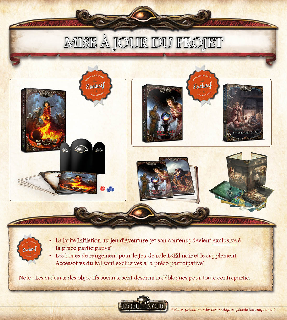 - les boîtes de rangement pour le Jeu de rôle L'Œil noir et son supplément Accessoires du MJ sont exclusives. Le Jeu de rôle L'Œil noir et Accessoires du MJ seront vendus sans boîte une fois passée la précommande participative et les précommandes des boutiques.