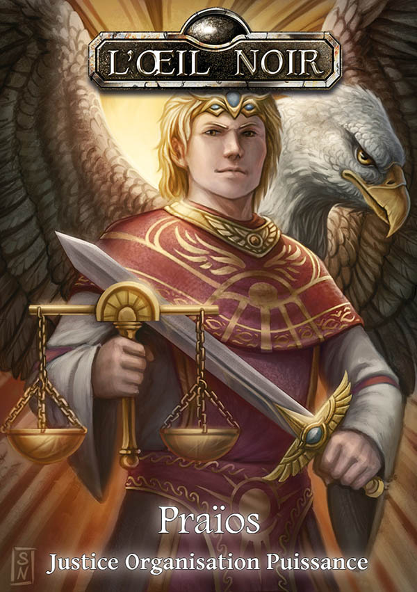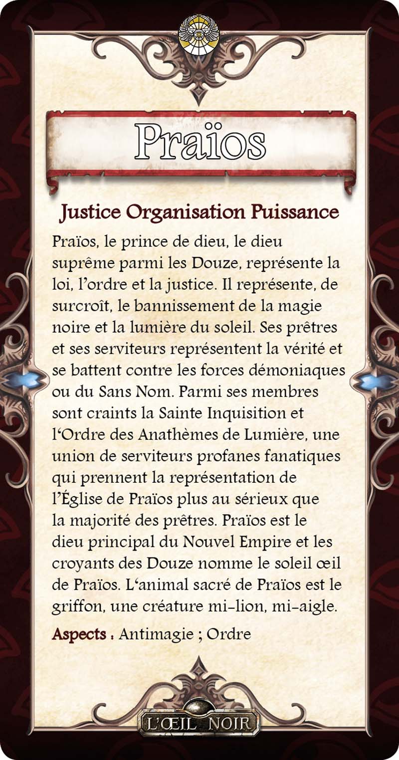 - la face d'information, comportant le nom du dieu, trois valeurs principales de son église, une description rapide ainsi que les aspects dans lesquels peuvent se spécialiser ses prêtres (nous rajouterons sans doute le renvoi de page vers la boîte Jeu de rôle et d'Aventure).
