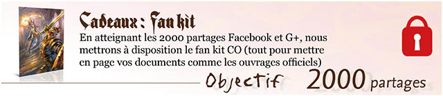 Le second, c'est un objectif social : à 2000 partages facebook/google+, nous proposerons un "fan Kit" Chroniques Oubliées Fantasy pour permettre aux créatifs de mettre en page leurs aides de jeu et scénarios dans la charte graphique officielle du jeu !