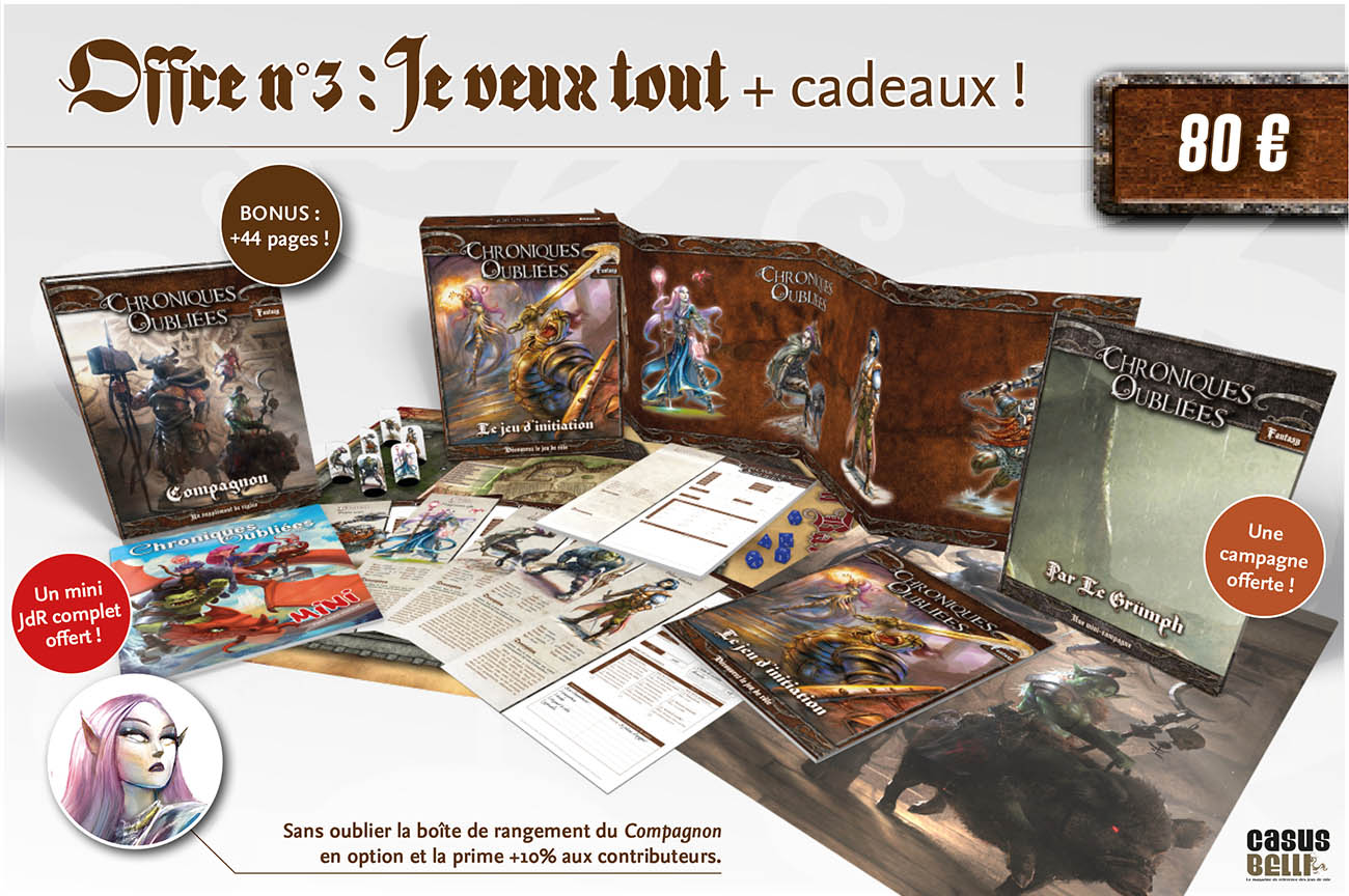 1 exemplaire du Compagnon et du Jeu d'initiation pour Chroniques Oubliées Fantasy (version papier et PDF) + cadeaux débloqués