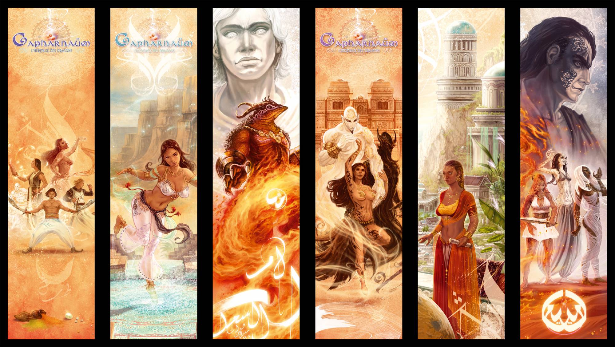 On dit que les dieux inspirent les hommes et guident le bras de leurs fidèles lorsqu’ils partent au combat. On dit aussi qu’ils aiment prendre forme humaine pour se livrer au jeu de la séduction avec nos femmes, se mêler à nos querelles, combattre à nos côtés. Rien n’est plus vrai ! La mythologie est en marche. Dieux et démons, djinns et Mirages existent bel et bien… Un dieu mineur sombré dans la démence et manipulant les hommes selon ses délires ; un Mirage emportant une caravane marchande dans les limbes du monde magique et un djinn qui vous donnera un tapis volant si vous le libérez de la lampe, sont des ingrédients que vous pourriez rencontrer dans une partie de CAPHARNAÜM : L’Héritage des dragons.