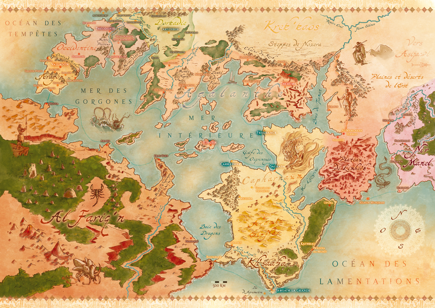Au loin, le continent noir d’Al-Fariq’n garde encore ses secrets, tandis qu’en Orient, en Nir Manel et en Asijawi, on produit nombre de denrées qui font la fortune des marchands de Jazîrat : soieries, épices, etc. On dit toutefois que seuls les marins les plus fous et les criminels qui n’ont plus rien à perdre osent naviguer sur les dangereuses mers du Sud. Enfin, bien loin des routes maritimes, les marches du Nord abritent les tribus barbares du Krek’Kaos. Bien qu’extrêmement désorganisées, les créatures qui peuplent les steppes et montagnes hostiles de ces régions meurtries par le froid mènent chaque année de nombreux raids vers les contrées ensoleillées du Sud.