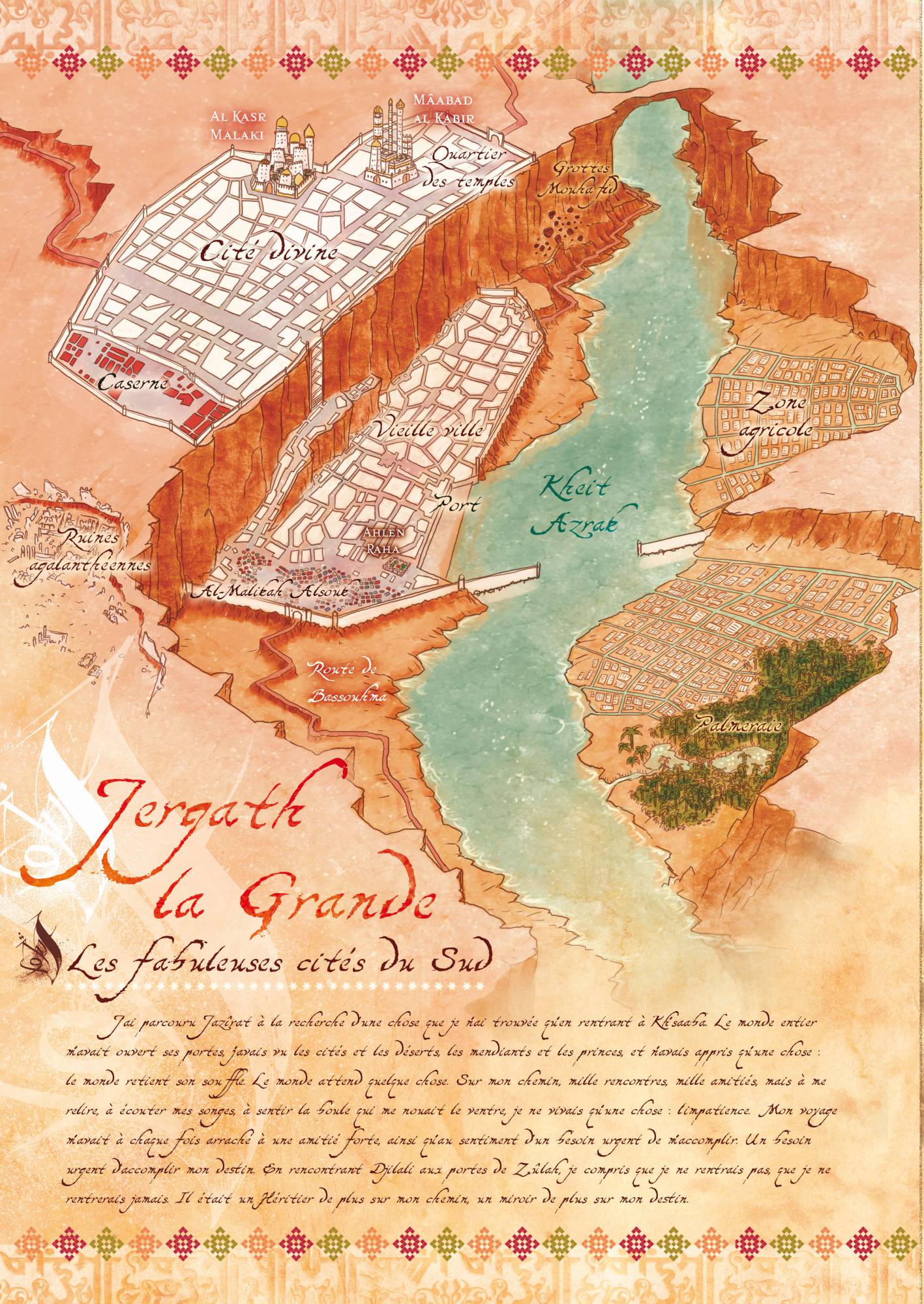 Au loin, le continent noir d’Al-Fariq’n garde encore ses secrets, tandis qu’en Orient, en Nir Manel et en Asijawi, on produit nombre de denrées qui font la fortune des marchands de Jazîrat : soieries, épices, etc. On dit toutefois que seuls les marins les plus fous et les criminels qui n’ont plus rien à perdre osent naviguer sur les dangereuses mers du Sud. Enfin, bien loin des routes maritimes, les marches du Nord abritent les tribus barbares du Krek’Kaos. Bien qu’extrêmement désorganisées, les créatures qui peuplent les steppes et montagnes hostiles de ces régions meurtries par le froid mènent chaque année de nombreux raids vers les contrées ensoleillées du Sud.