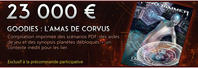 Contenu exclusif : Nous allons créer du contenu spécifique à la VF, supervisé par Sarah Newton. L’Amas de Corvus en sera le premier exemple : ce contenu exclusif est créé par Antoine Lejeune, démonstrateur officiel de Mindjammer (que vous avez pu croiser lors des démos en ligne ou lors de nos déplacements). Sarah Newton participera aussi à L’Amas de Corvus en créant un scénario exclusif, si le palier correspondant est atteint.