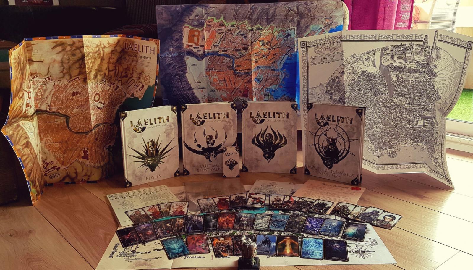 La boîte contenant Laelith, la Cité mystique + Ecran du MJ + Guide pratique + 4 × Guide du joueur + 2 cartes A2 de Laelith (papier + PDF) + nom dans Laelith