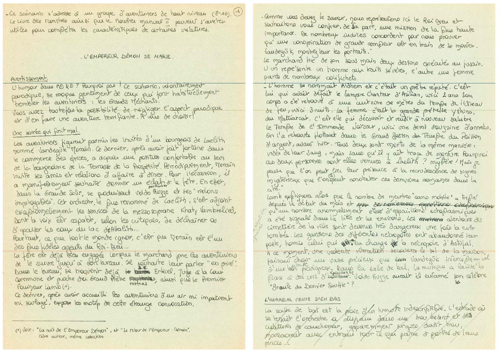 Concernant la campagne, il y a environ six mois, Tête Brûlée a posté un message sur le forum interne de Laelith. Il y expliquait que, pour diverses raisons, la campagne initialement prévue était sur la touche, et demandait s’il y avait des volontaires pour proposer quelque chose. Deux heures plus tard, je lui soumettais une première trame qui lui a plu. Celle-ci a débouché sur un synopsis détaillé, puis sur l’écriture de la campagne.