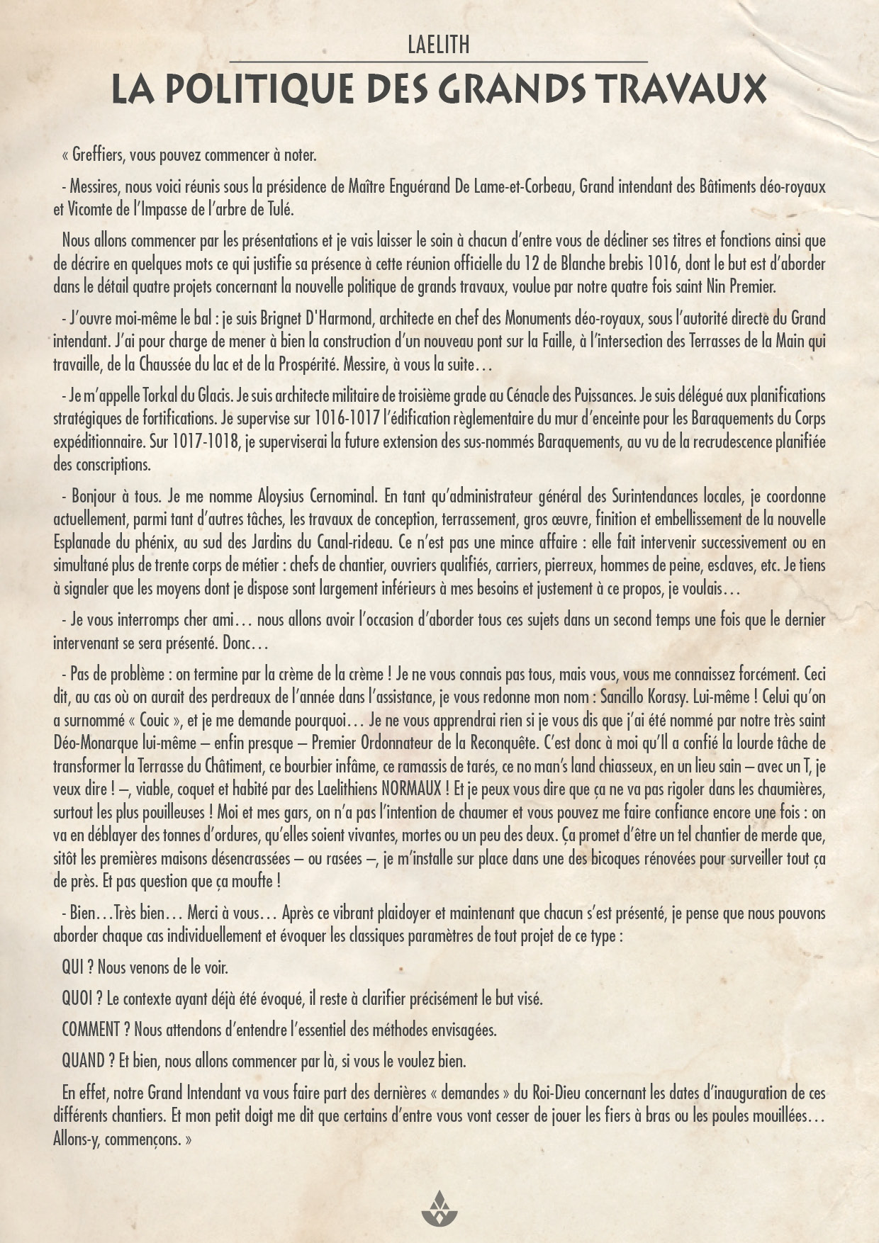 Ecrite par Arnaud Dufaure, Xavier Aussibal et Thierry Genestier, trois énormes joueurs (attention les heures de vol au compteur !) ayant traînés leurs guêtres dans Laelith pendant des dizaines d’années (!), elle est actuellement remaniée par Agnès Pernelle, très saint pilier du "rendu et du contrôle des copies" à l’époque de la première version du magazine Casus Belli.