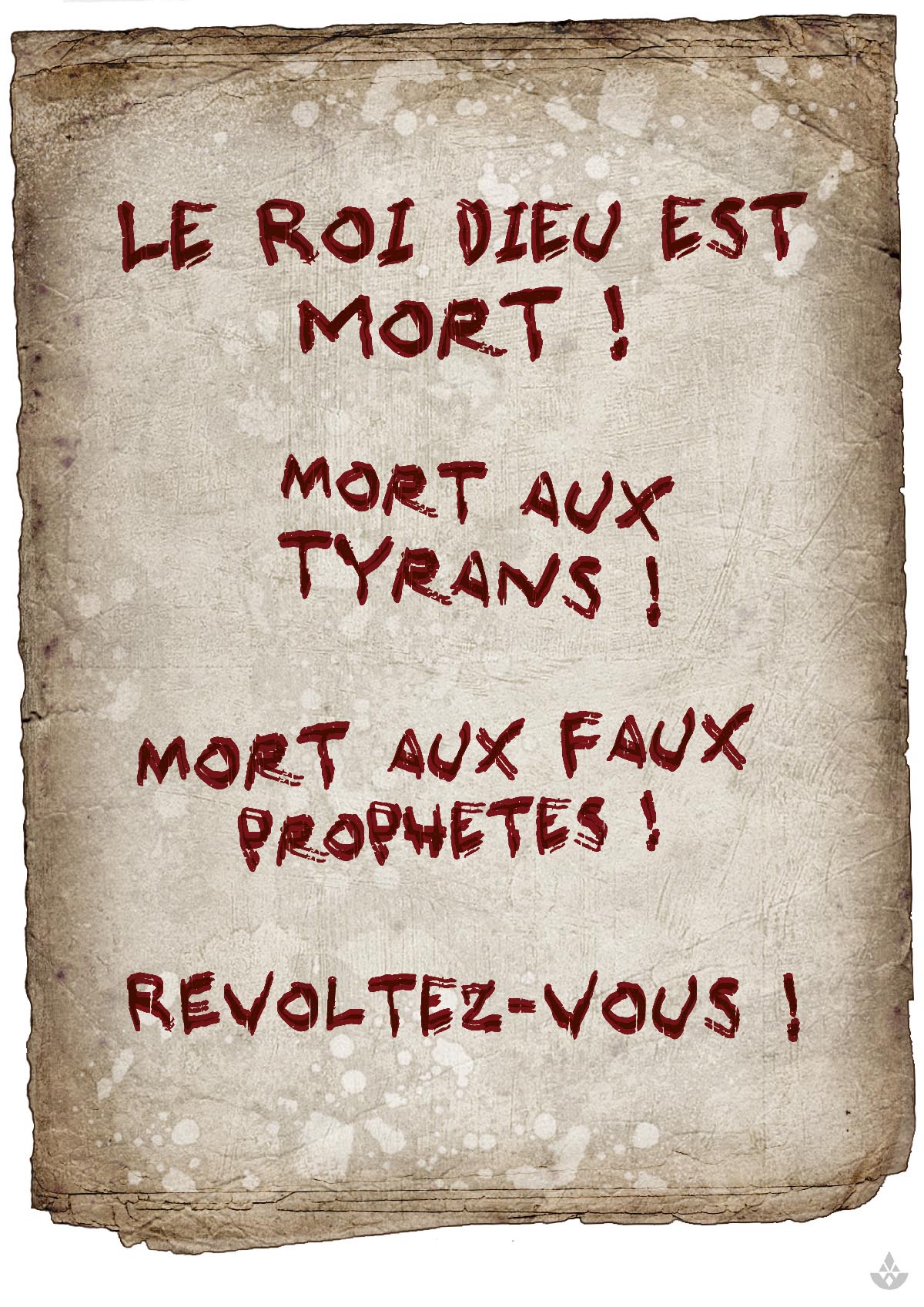 « Trevelian tente sa chance ! Dans la matinée, l’horrible créature se serait introduite dans les appartements de notre bien aimé Teaphanerys XIV. Les efforts de la garde pourpre ont permis de repousser l’attaque et notre bien aimé Roi-Dieu est sain et sauf. »