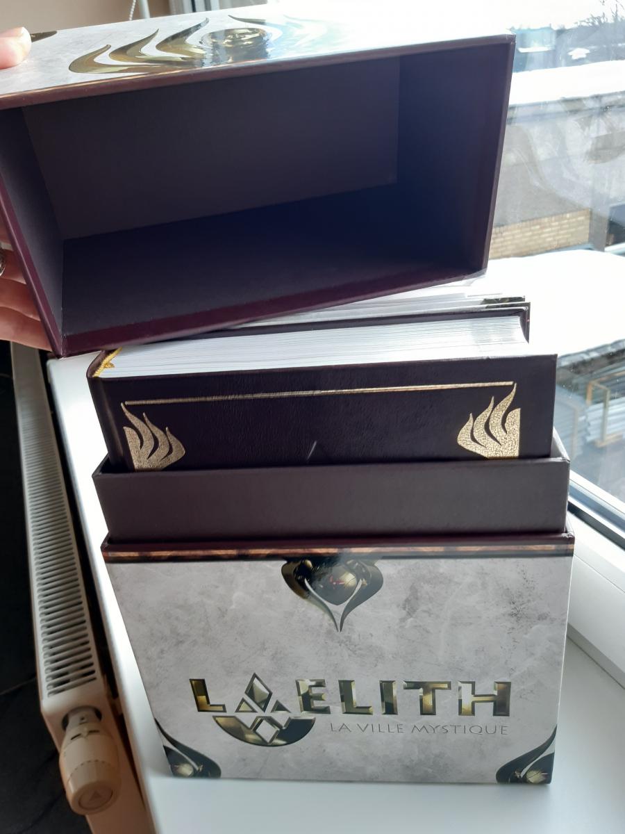La boîte contenant l'édition collector limitée de Laelith, la Cité mystique + Ecran du MJ + Guide pratique + 4 × Guide du joueur + 2 cartes A2 de Laelith (papier + PDF) + nom dans Laelith