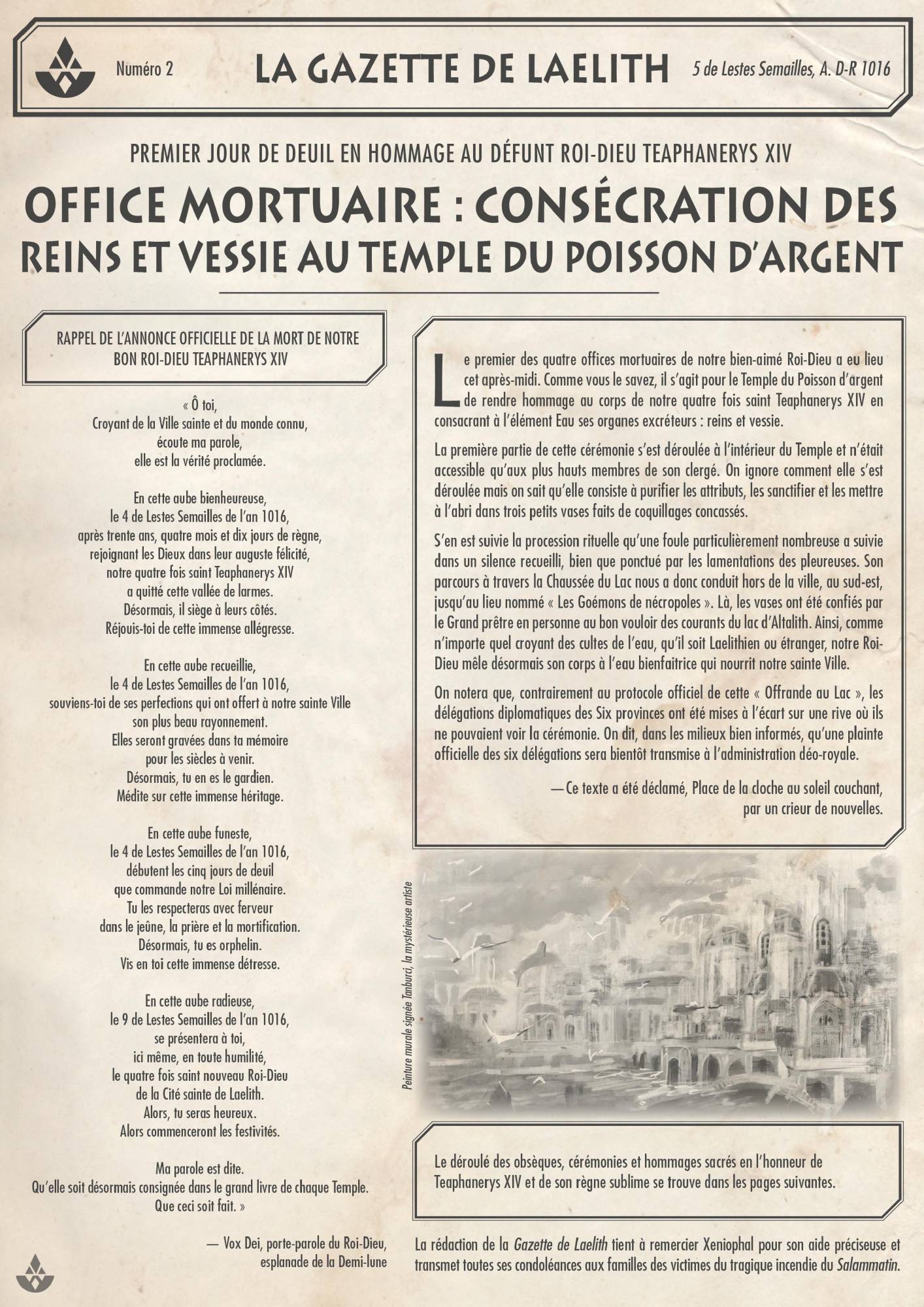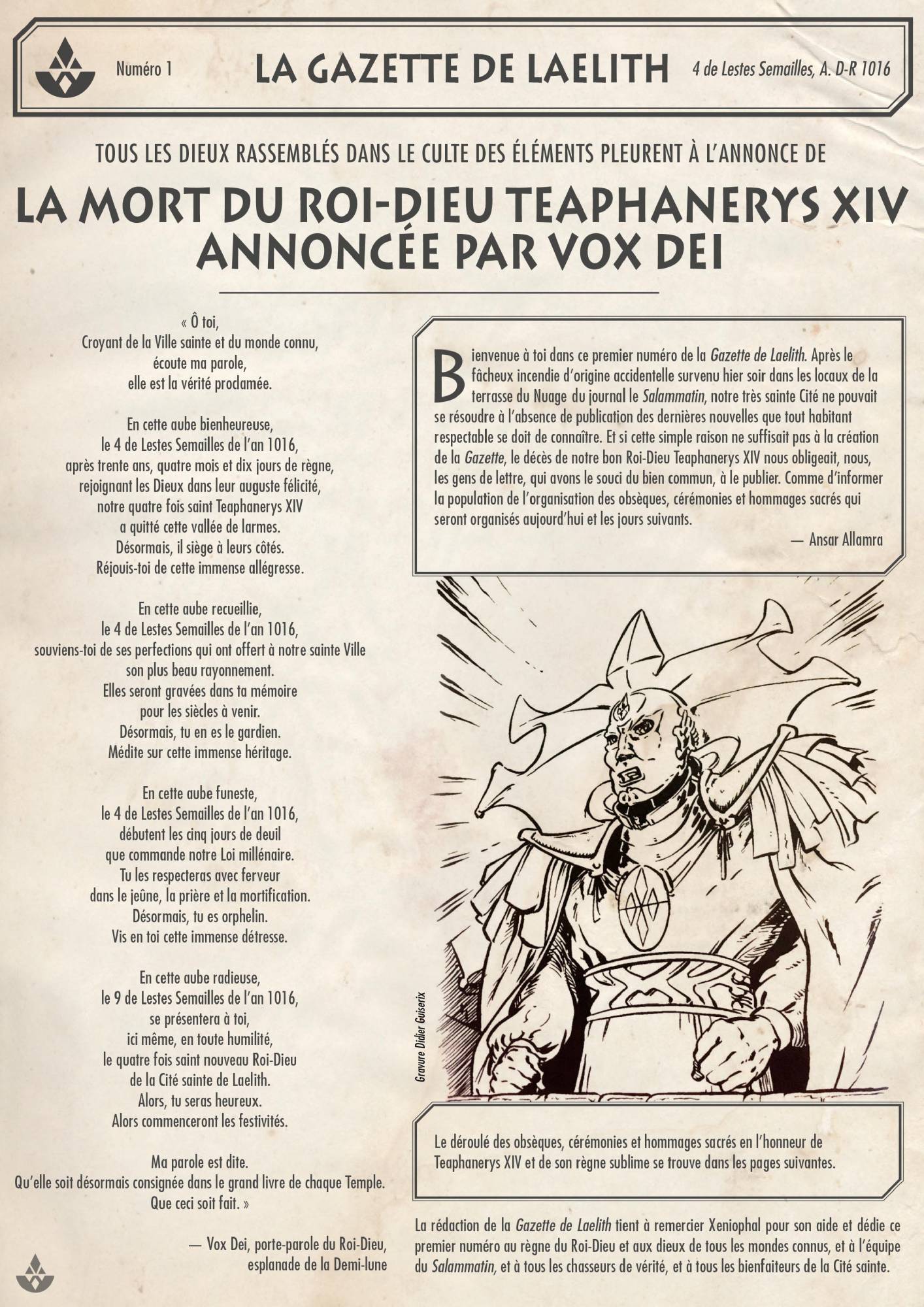 En attendant de pouvoir vous montrer tout cela, nous nous dirigeons vers la publication des premiers PDF débloqués lors de ce projet. En effet, la première Gazette de Laelith, dont les "Une" ont été publiées lors de la précommande participative "en temps réel" pour vous faire vivre l'avènement du nouveau Roi-Dieu, est disponible en PDF dans la Bibliothèque PDF du compte de tous les backers ayant eu accès aux cadeaux sociaux. A télécharger immédiatement.
