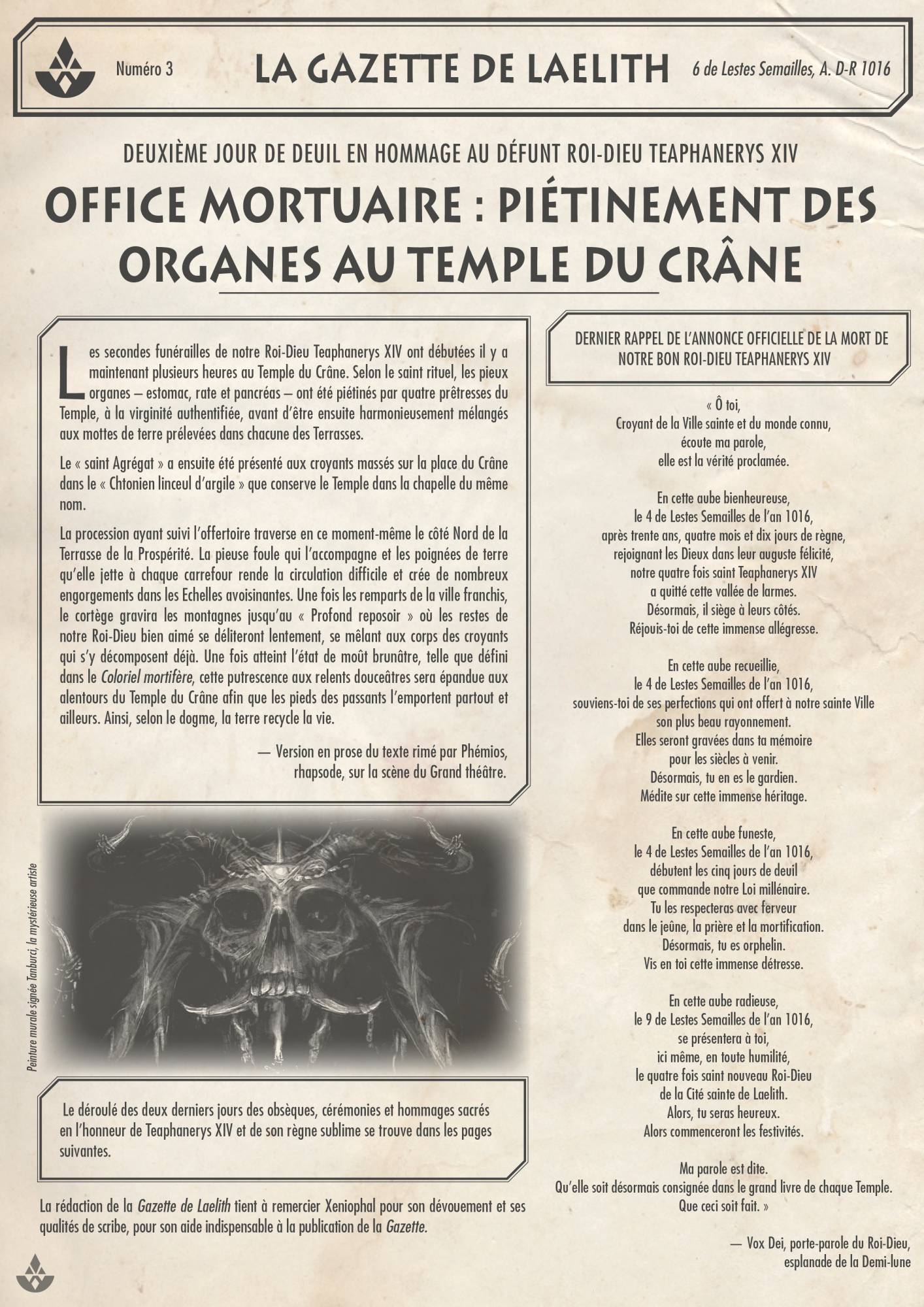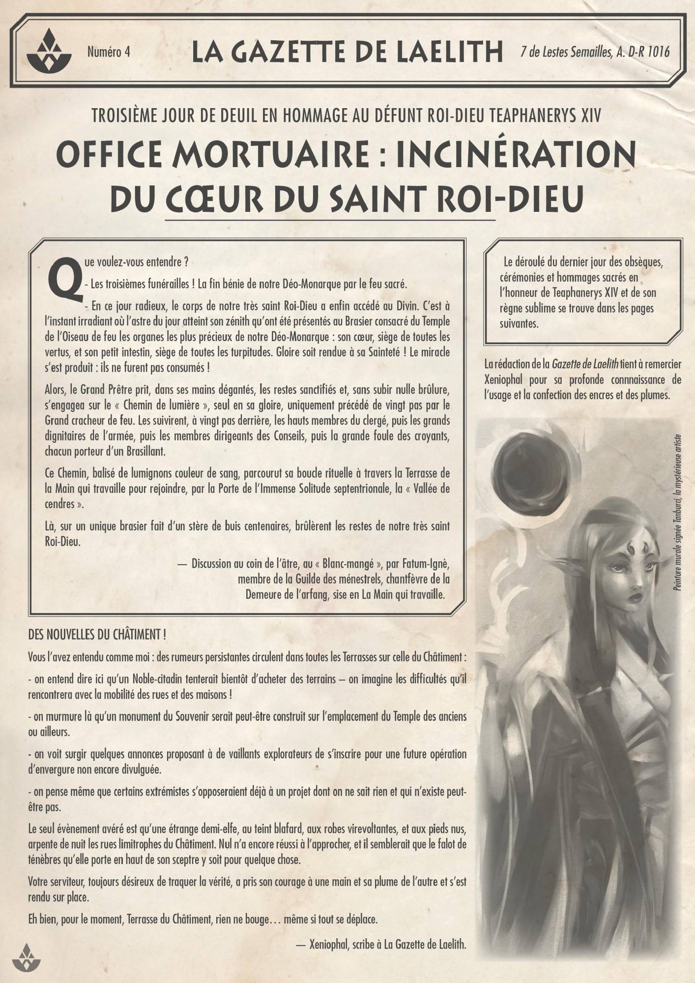 Après le PDF de la première Gazette de Laelith le mois dernier, nous vous proposons aujourd'hui le deuxième et troisième numéro de cette feuille de choux qui est née lors de la précommande participative (à télécharger depuis votre compte client > Bibliothèque PDF). En effet, c'est en discutant avec Jean-Marie Noël que nous avons décidé de mettre en scène en "temps réel" la mort du Roi-Dieu, ses funérailles et sa succession. Donnant lieu à un moment assez épique et à des idées assez savoureuses (les descriptions des funérailles dans chacun des temples sont vraiment sublimes !!), l'idée est venue d'imprimer l'intégralité de ces Gazettes et pas seulement les "unes", publiées lors de la PP.