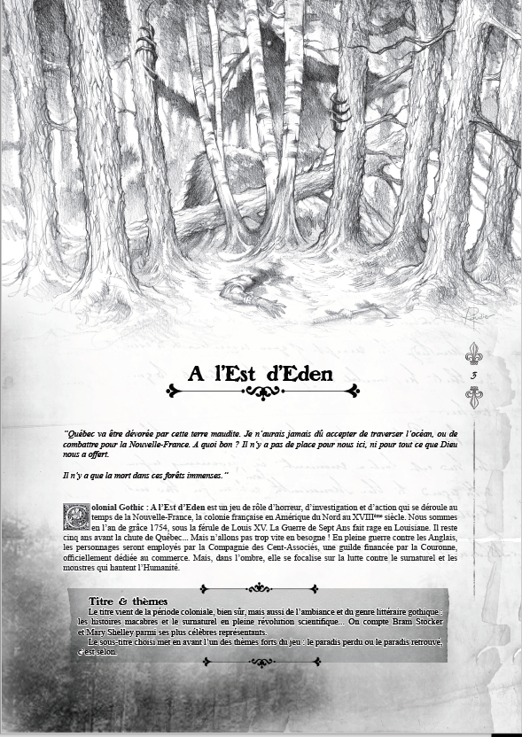 Colonial Gothic : A l’Est d’Eden est un jeu de rôle d’horreur qui se déroule au temps de la Nouvelle France, la colonie française du XVIIIème siècle en Amérique du Nord. Nous sommes en l’an de grâce 1754, sous la férule de Louis XV. La Guerre de Sept Ans fait rage en Louisiane. Il reste cinq ans avant la chute de Québec...