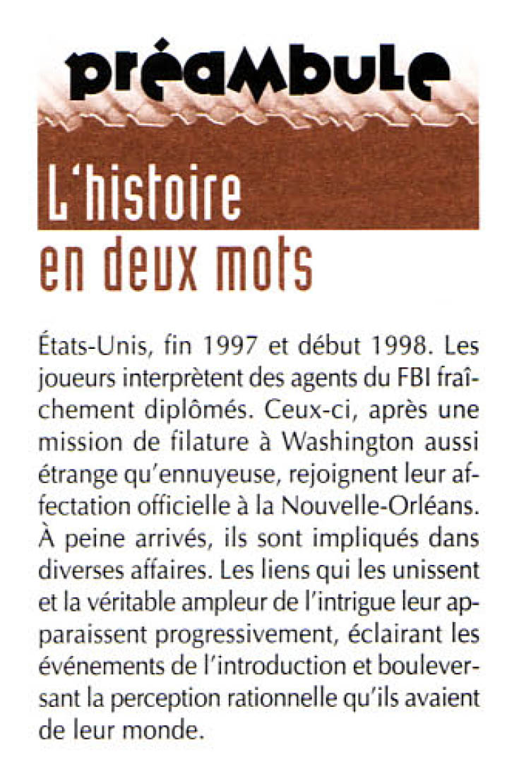 Il y a trois gros scénarios, avec des personnages prétirés, plein de conseils pour enrichir la trame centrale, des précisions pour donner de la profondeur au contexte (les lieux décrits existent vraiment pour la plupart, j'ai juste modifié quelques noms de rues, ajouté des éléments pour les scénarios et déformé la réalité).
