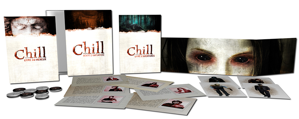 Option : La Boîte d'Initiation Chill contenant un livre du meneur, un livre d'aventures composé de deux scénarios, 10 jetons, 2d10, 6 fiches archétypes, 5 fiches monstres, et un écran souple, format paysage.