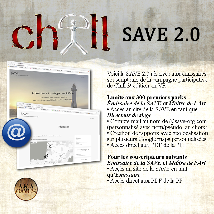 Ce pack comprend le livre de base de Chill +PDF, et son écran, le Guide de la SAVE, la boîte de rangement, 5 carnets de l'émissaire, 20 fdp et la chemise couleur, un poster exclusif A2, l'insertion de votre nom et tous les objectifs débloqués !