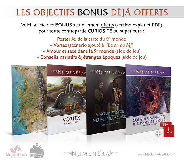 Ayant retenu les leçons de nos premiers crowdfunding (dont La Colère des justes qui vient de se terminer, la Campagne + Ecran Deadlands qui arrive désormais à terme et le massif Pavillon Noir 2 qui va encore nous demander plusieurs mois de travaux tant le travail était conséquent), nous avons décidé de lancer Numenéra avec la certitude que le travail est suffisamment avancé pour permettre une livraison finale beaucoup plus rapide estimée de 3 à 4 mois (avec les PDF disponibles quelques semaines après la fin du crowdfunding).
